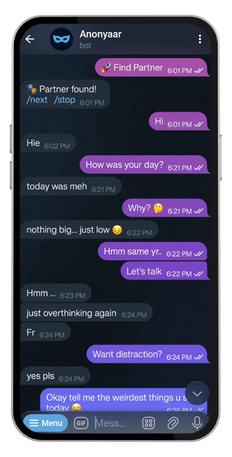 Open Anonyaar Bot and tap Start Chat. That’s it. No login, no forms, no waiting.